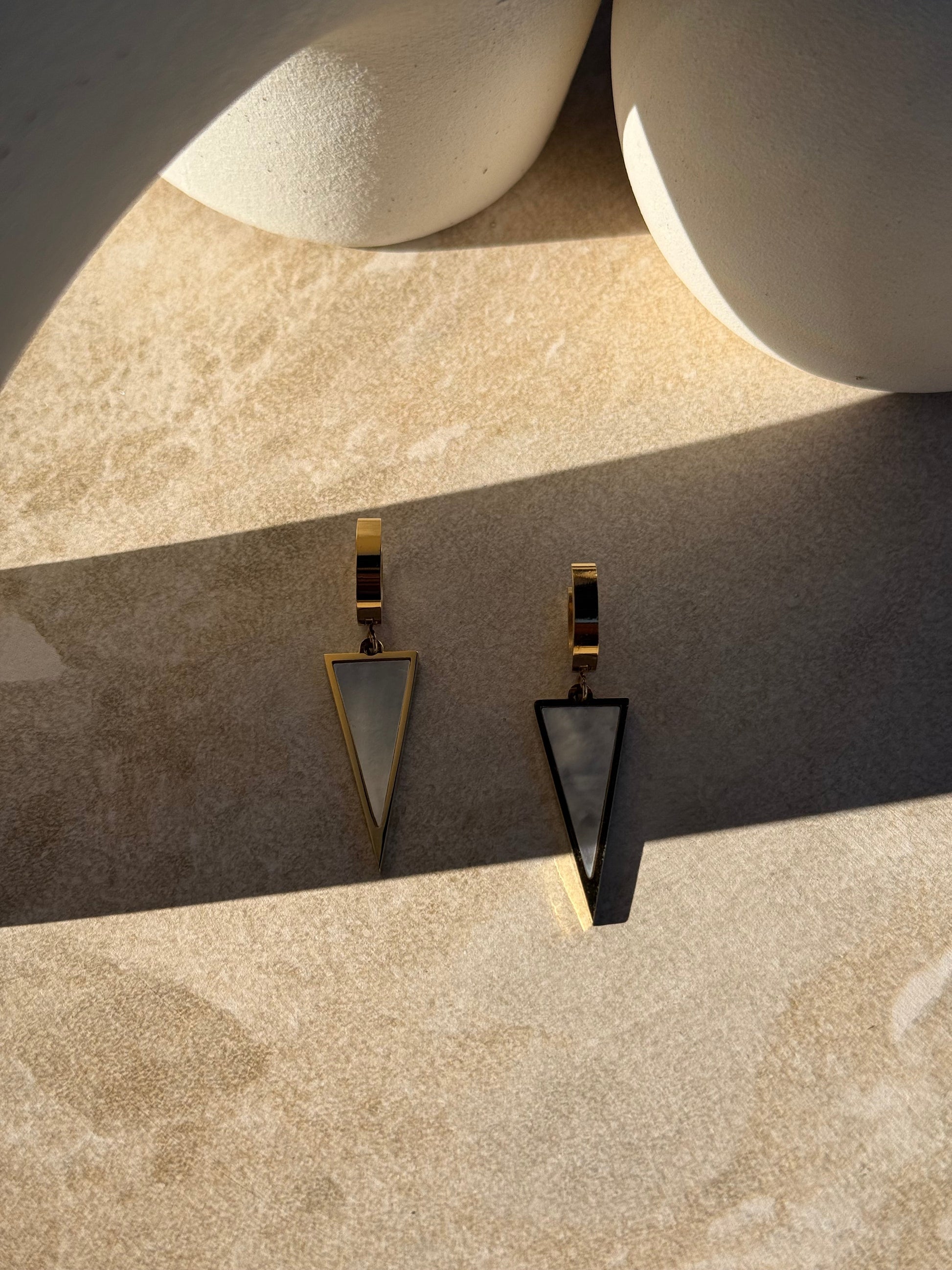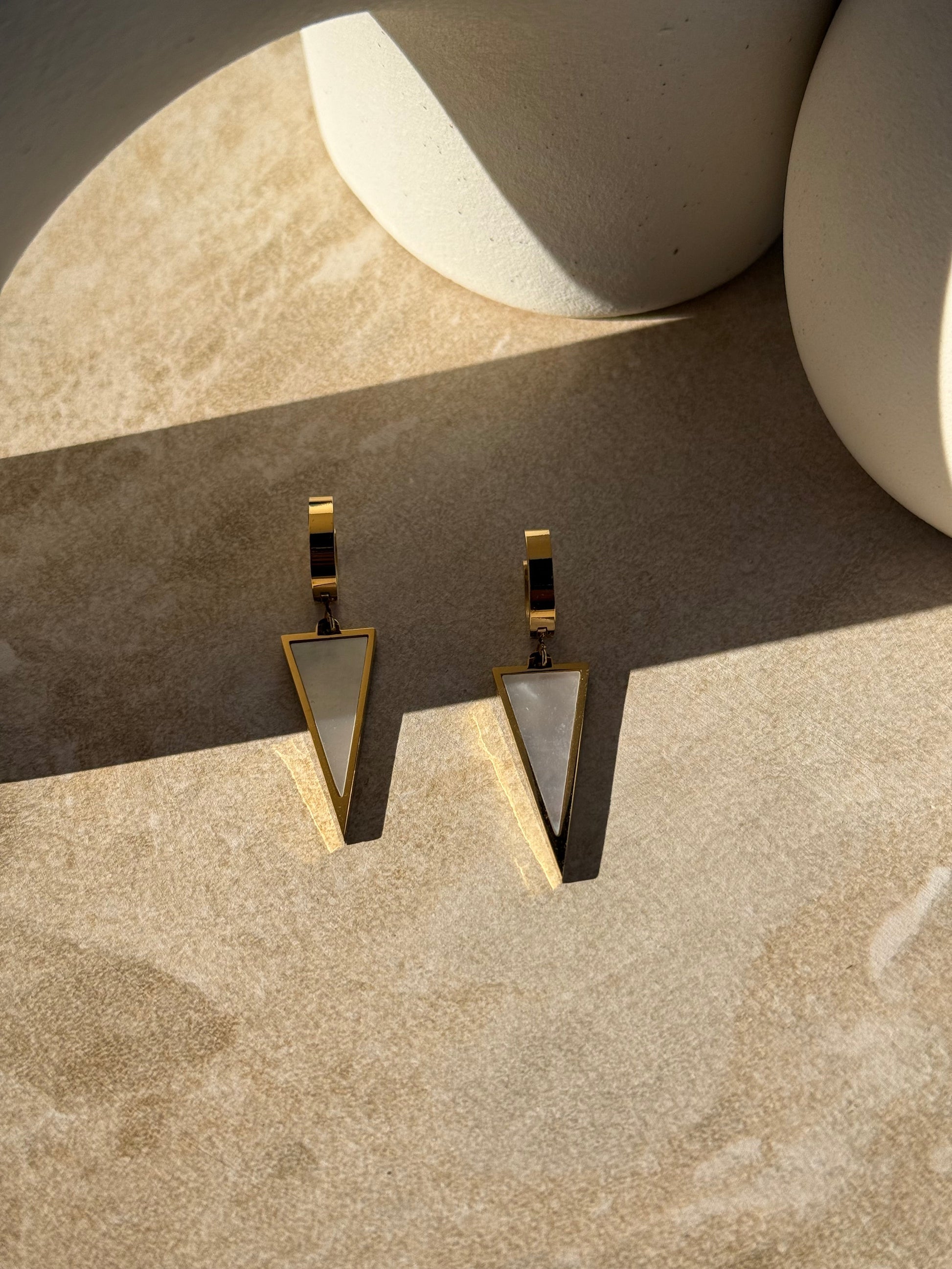 Sharp. Sleek. Empowered. Kōkiritia speaks to those who move with purpose. Inspired by the form of an arrowhead or a mauri stone, these striking gold and pearlescent triangle earrings represent strength, focus, and the journey forward.