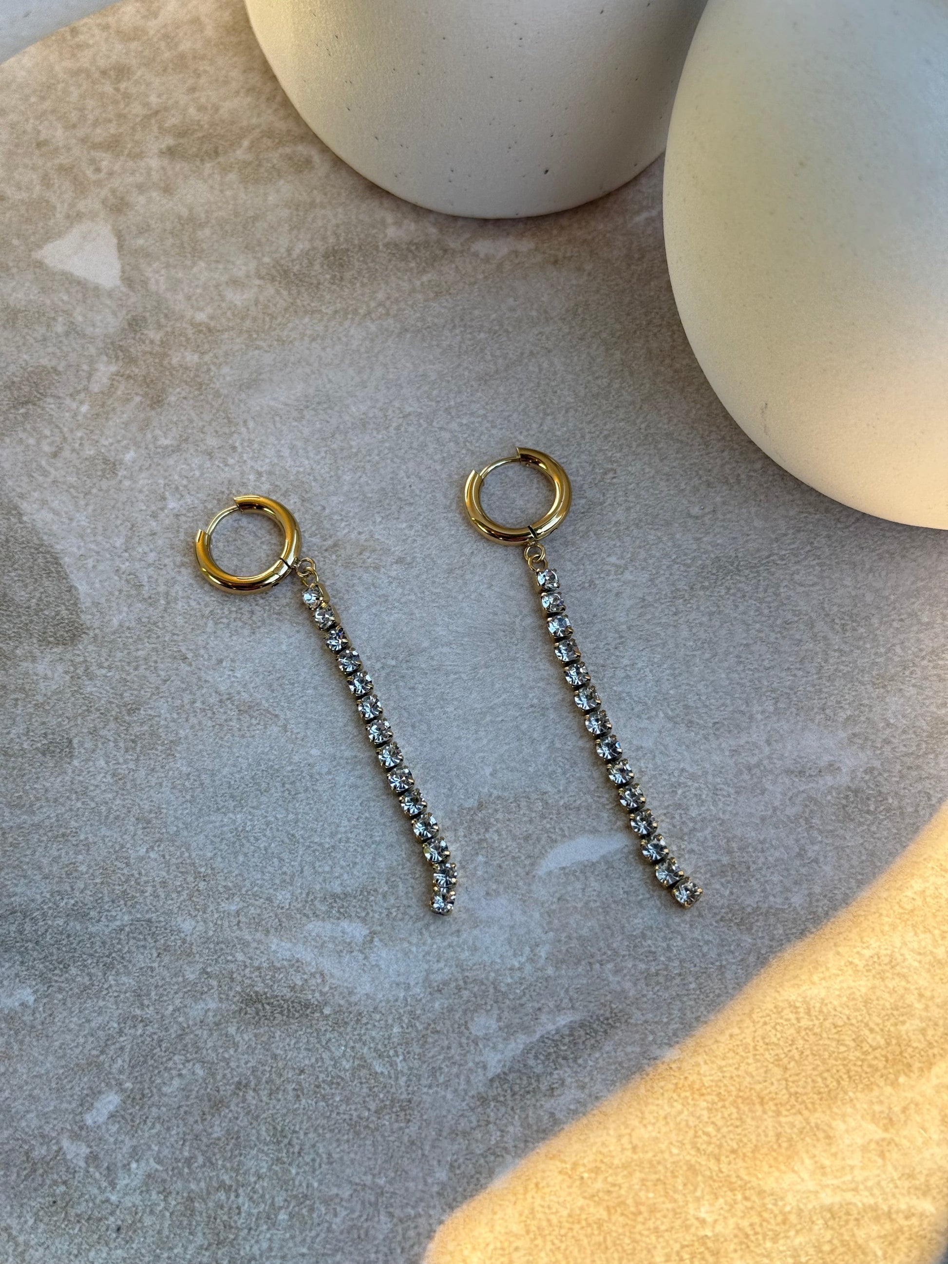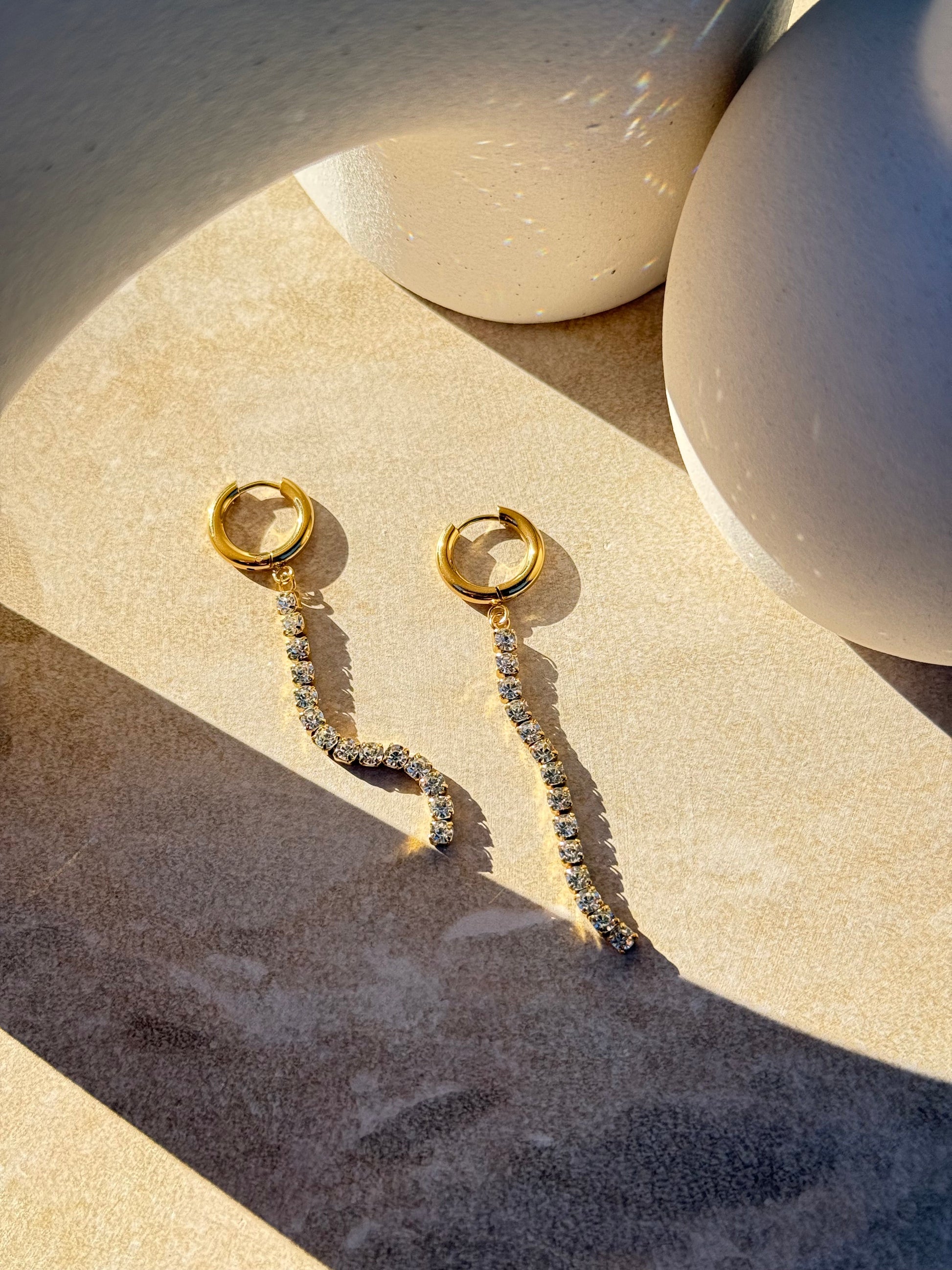 Elegant and luminous, Māhina Roa captures the essence of moonlight stretching across the night sky. The elongated white diamond shape symbolizes clarity and insight, while the gold Huggie hoop grounds the piece in warmth and strength.
