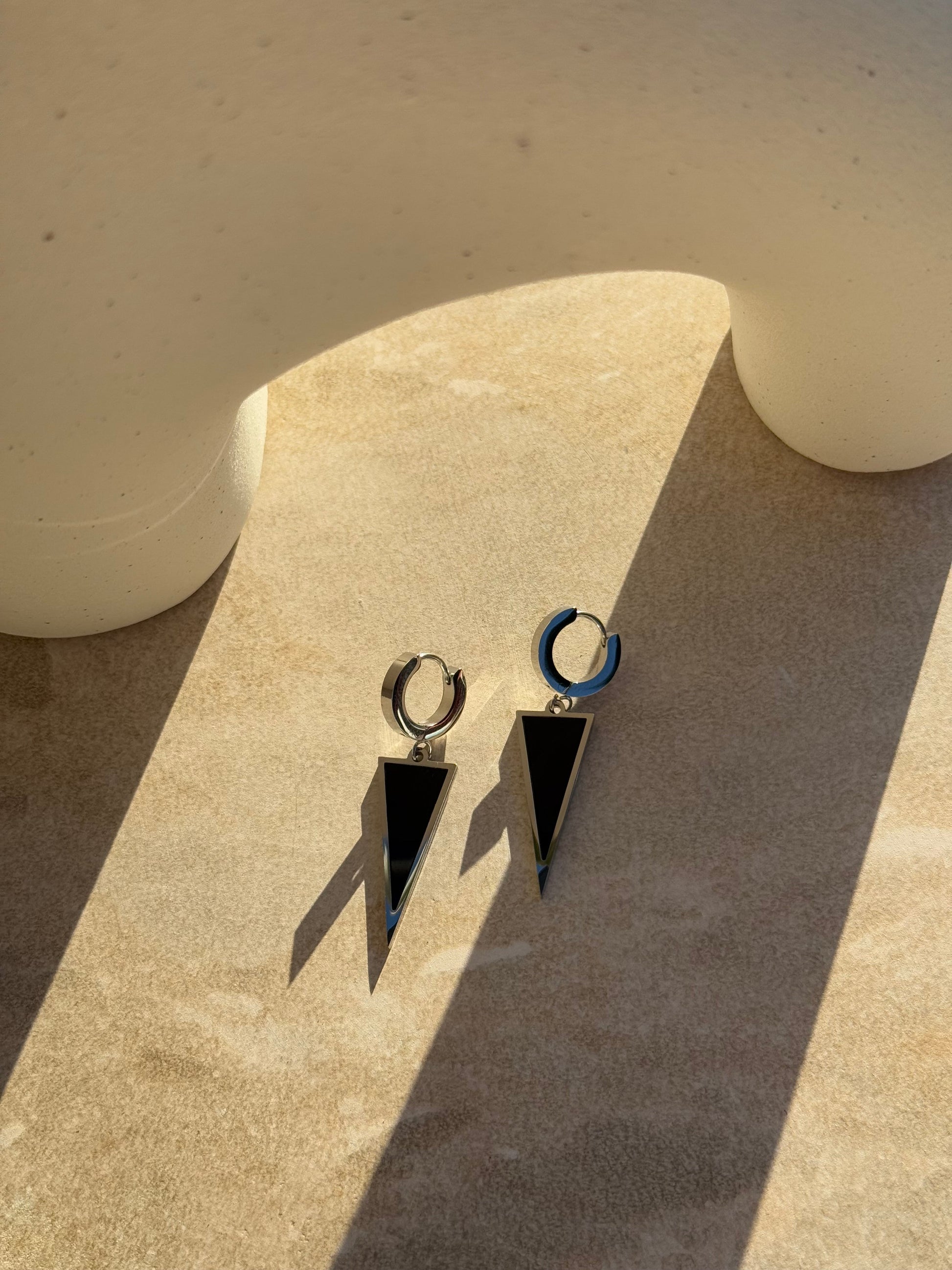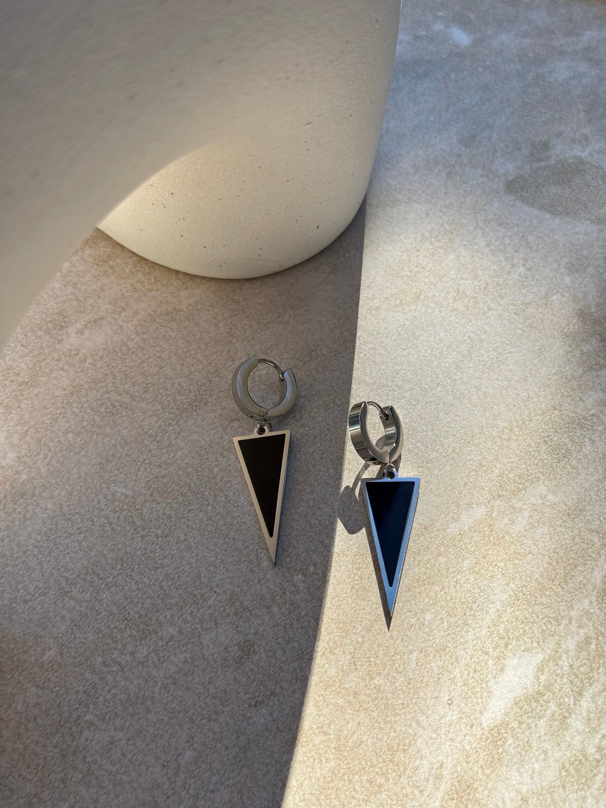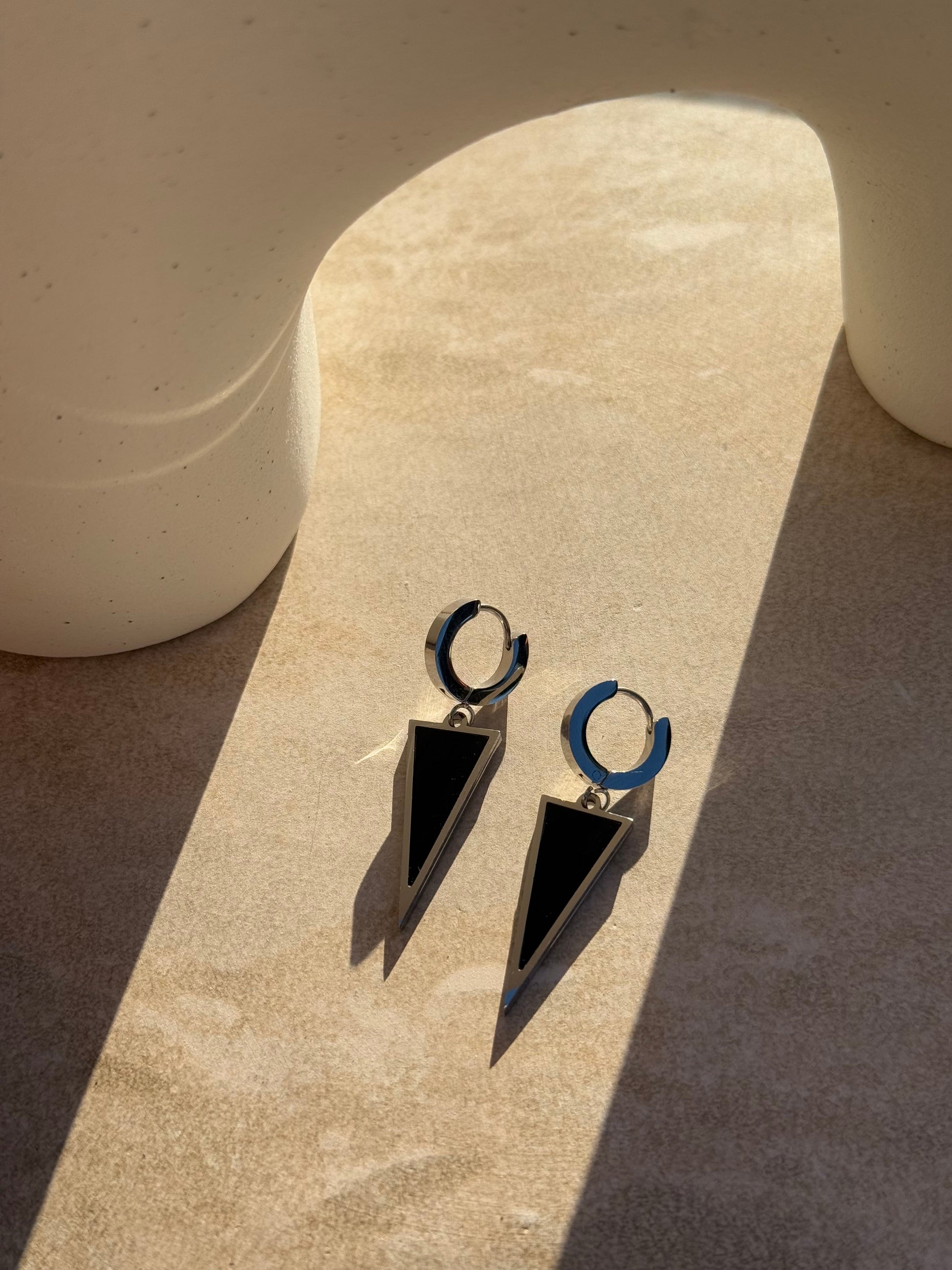 Embodying strength and simplicity, the Rautahi Silver Huggies feature a striking silver huggie design with a bold black triangular pendant. Inspired by the sleek elegance of a single blade (rautahi), these huggies are a perfect balance of contemporary sophistication and timeless style.