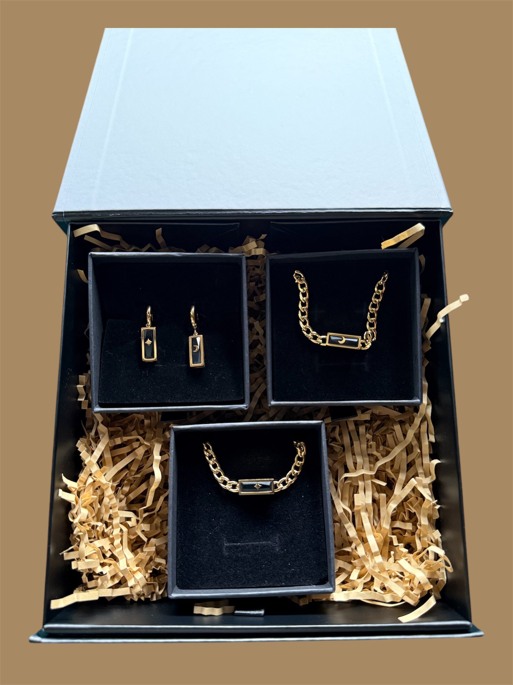 The Whetū & Marama Pango Set unites the brilliance of the stars (whetū) and the quiet power of the moon (marama) in a striking palette of black and radiant gold.